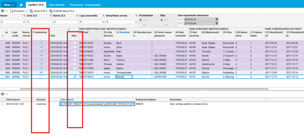 Rys. 10. Wykaz błędów z importu elektronicznych zasiłków