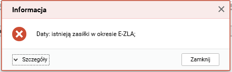 Komunikat wskazuje, że w systemie zostały zarejestrowane zasiłki w okresie podanym na e-zwolnieniu.