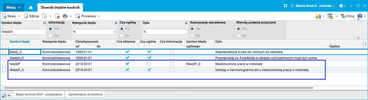 Powyższe definicje błędów dodano jako aktywne od daty ich obowiązywania, czyli od 1 marca 2018 roku.