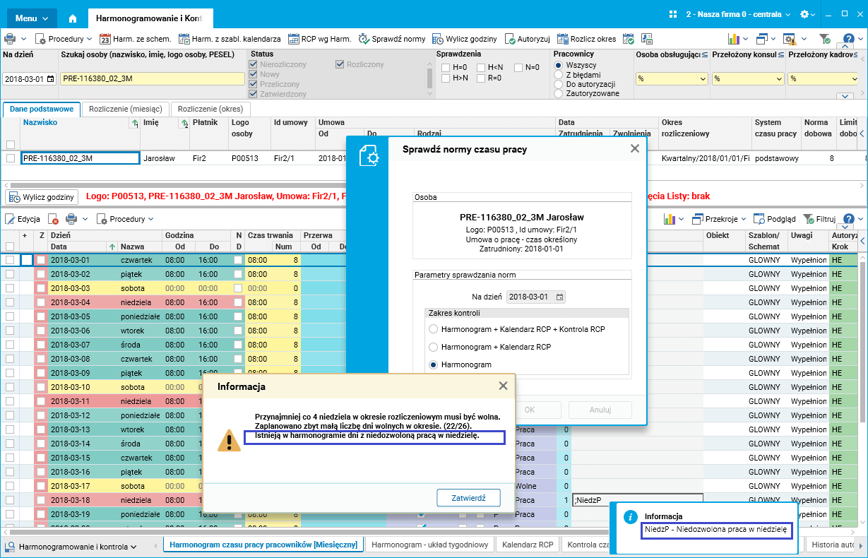 · NiedzP – błąd indywidulany, sygnalizowany komunikatem: Niedozwolona praca w niedzielę.