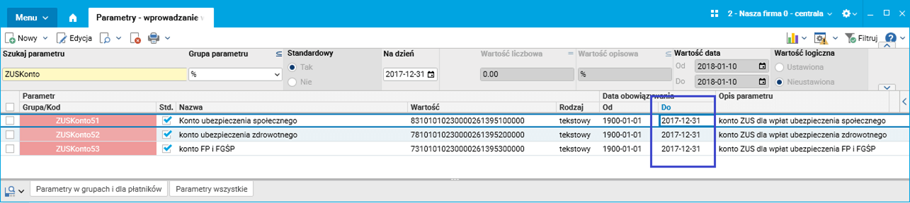 W aplikacji Softlab HR by Asseco parametry określające poprzednie rachunki bankowe do opłacania składek ZUS zostały zamknięte z datą obowiązywania do 31-12-2017.