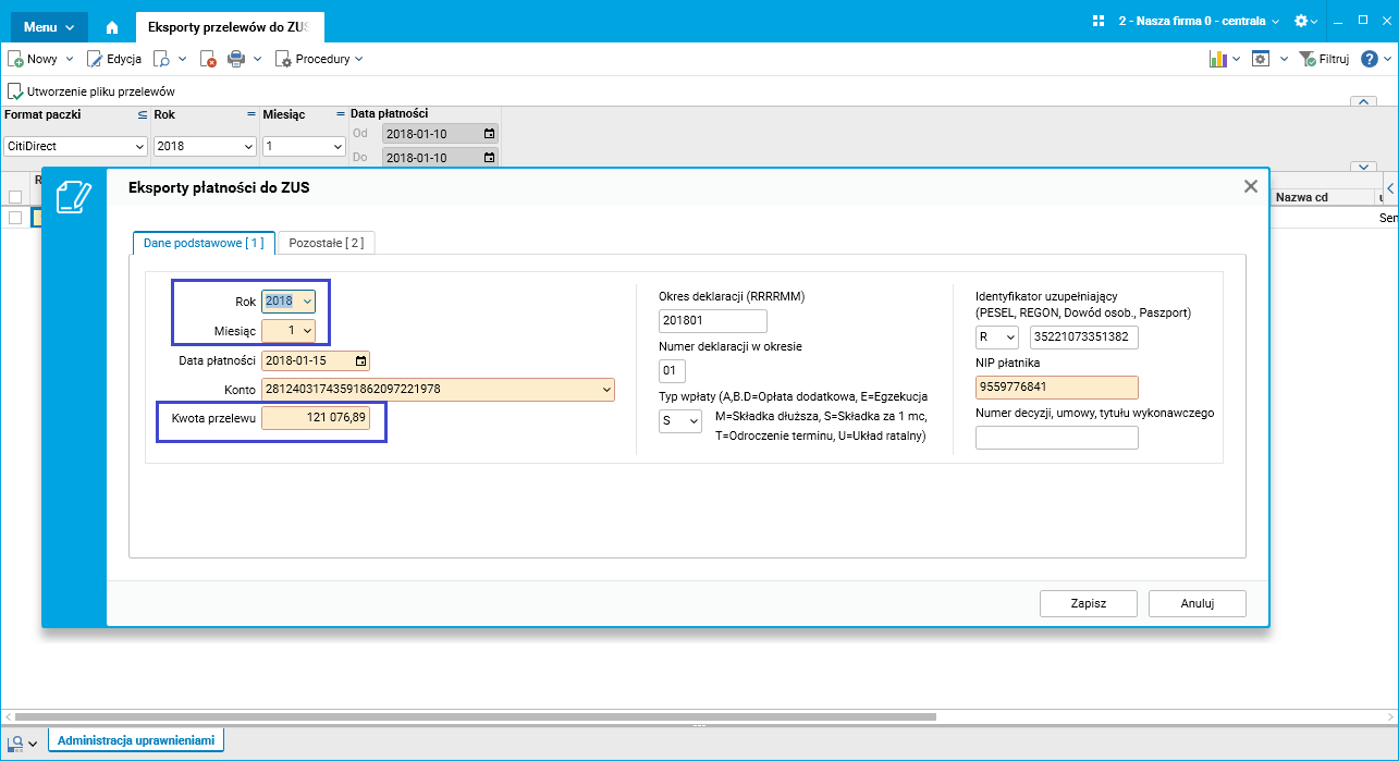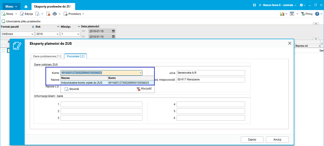 Od 1 stycznia 2018 roku, dodając nowy przelew do ZUS-u w słowniku Eksporty przelewów do ZUS, należy wiedzieć, że kwota przelewu na zakładce Dane podstawowe jest sumą kwot z tytułu ubezpieczeń społecznych, zdrowotnych, FP i FGŚP. W zakładce Pozostałe konto pochodzi z wartości parametru ZUSKonto5Indyw.