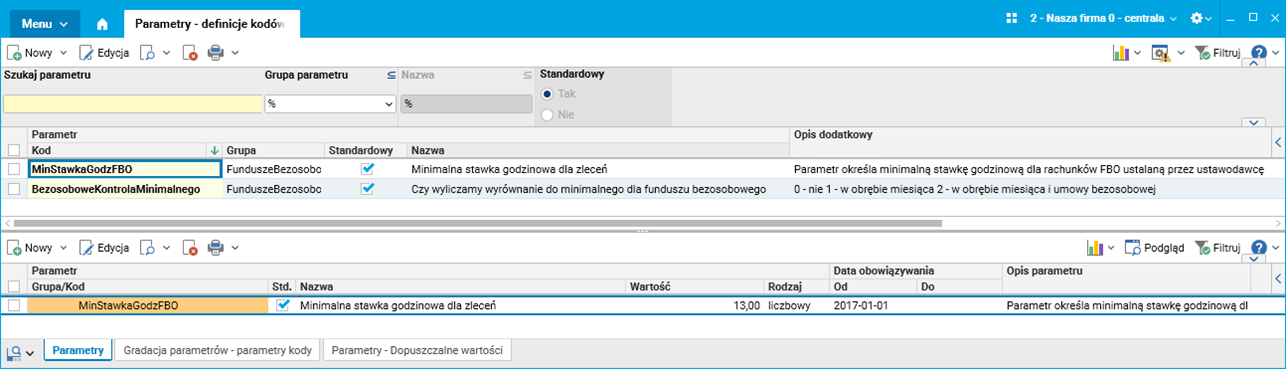 Minimalną stawkę dla zleceń określa parametr MinStawkaGodzFBO, natomiast działanie funkcjonalności naliczania wyrównania do stawki minimalnej określa parametr BezosoboweKontrolaMinimalnego, który może przyjmować wartości:
