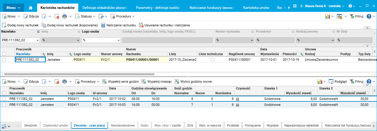 Rys. Rachunek w słowniku Kartoteka rachunków, szczegół Zlecenia – czas pracy