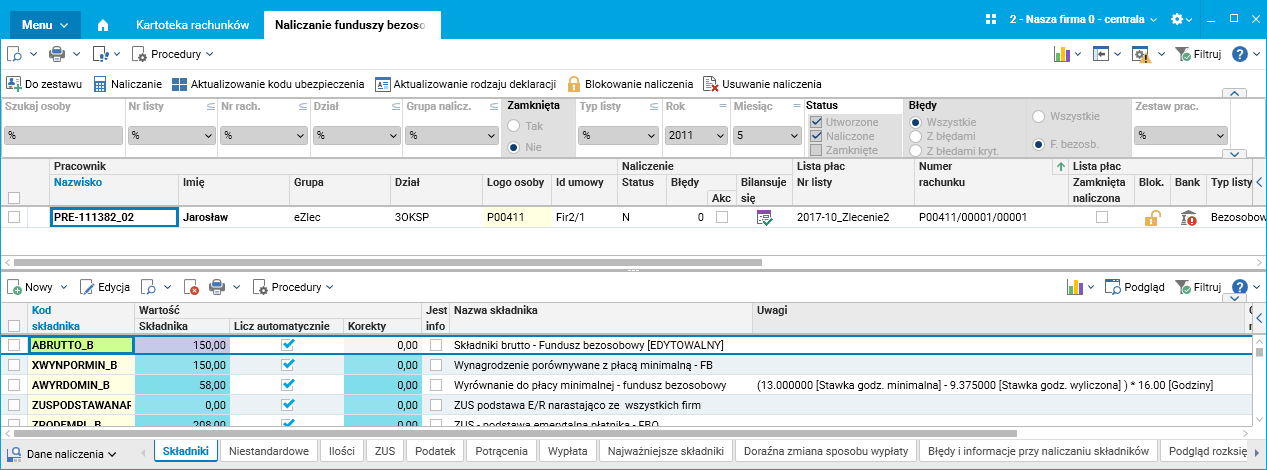 Rys. Naliczenie rachunku w słowniku Naliczanie funduszy bezosobowych, szczegół Składniki