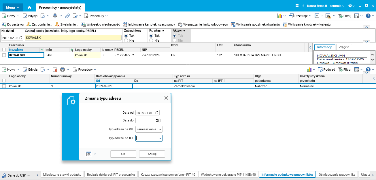 Rys. Procedura Zmiana typu adresu w słowniku Pracownicy – umowy(etaty), szczegół Informacje podatkowe pracowników
