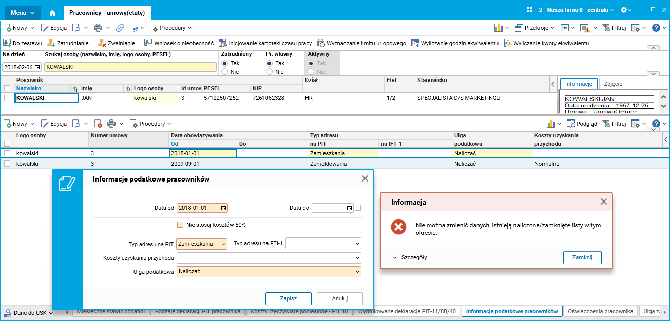 Rys. Blokada zmiany danych podatkowych w zablokowanym okresie listy płacowej