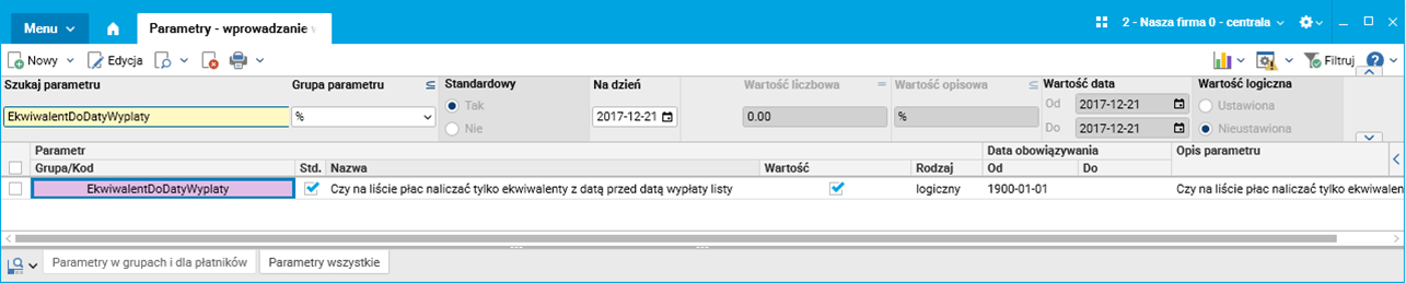 Przy ustawionym parametrze EkwiwalentDoDatyWyplaty data ekwiwalentu porównywana jest z datą wypłaty listy płac i ekwiwalent wypłacany jest tylko na listach z datą wypłaty równą lub większą niż data ekwiwalentu.