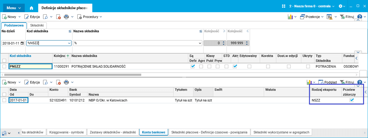 Rys. Składnik płacowy z przelewem zbiorczym w słowniku Definicje składników płacowych