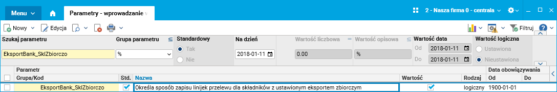 W tym celu dodano parametr EksportBank_SklZbiorczo w grupie parametrów EksportBank, który określa sposób zapisu linijek przelewu dla składników z ustawionym eksportem zbiorczym. Nowy parametr pozwala na eksport do banku w trybie zbiorczym, ale z podglądem wszystkich indywidualnych linijek eksportu.