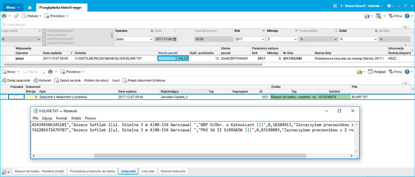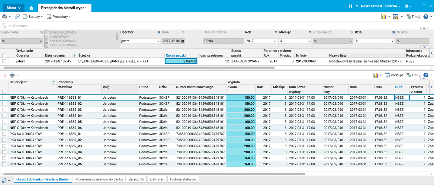 Przykładowy eksport do dwóch banków dla składnika z przelewem w trybie zbiorczym, przy ustawieniu parametru EksportBank_SklZbiorczo=1: