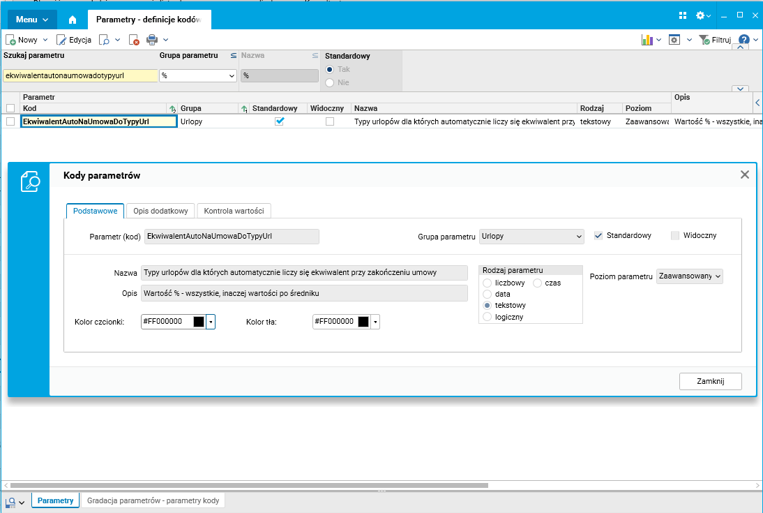 W aplikacji dodano logiczny parametr systemowy EkwiwalentAutoNaUmowaDoTypyUrl, który pozwala na określenie typów urlopów, dla których automatycznie naliczane będę ekwiwalenty po zakończeniu umowy. Wartość „%” wskazuje na wszystkie typy urlopów. Można też wskazać konkretne typów urlopów, np.: „w”, co pozwala na naliczenie ekwiwalentu tylko dla urlopu wypoczynkowego.