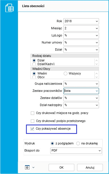 W parametrach wydruku Lista obecności dodano parametr Czy pokazywać absencje.