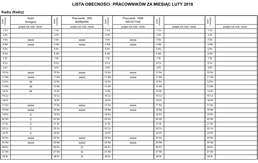 Celem zmiany było zwiększenie użyteczności raportu Lista obecności poprzez automatyczne umieszczenie na wydruku nieobecności pracownika zarejestrowanych w aplikacji w momencie sporządzania wydruku.