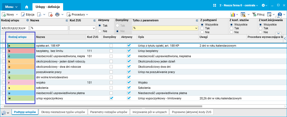 Dla absencji urlopowych oznaczenia na wydruku pochodzą z pola Rodzaj urlopu ze słownika Urlopy – definicje.