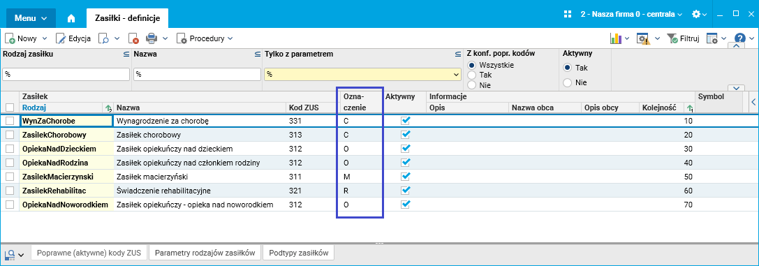Dla absencji zasiłkowych oznaczenia na wydruku pochodzą z pola Oznaczenie ze słownika Zasiłki – definicje.