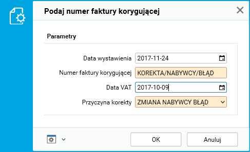 · ZMIANA NABYWCY BŁĄD (Zmiana nabywcy – z powodu błędu) – umożliwia korektę nabywcy. Tę przyczynę korekty wybieramy np. w sytuacji, gdy wprowadzony nabywca został wybrany błędnie, nie miał z transakcją nic wspólnego i nie przyjął faktury. Przy czym moment zauważenia błędu jest odsunięty w czasie i nie można już edytować dokumentu pierwotnego. Zmianę wprowadzamy dokumentem korekty, aby wykazać, że zmiana nastąpiła, ale w samej ewidencji nie chcemy wykazywać korekty, tylko pokazać fakturę źródłową ze zmienionym nabywcą. W przypadku zmiany nabywcy, który jest również płatnikiem, przeksięgowywane są również należności między kontrahentami.