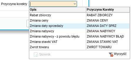 Na liście wyboru przyczyn korekty dodano następujące pozycje, których wybór wpływa na sposób księgowania korekty oraz jej ewidencję VAT i JPK: