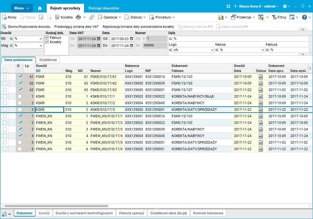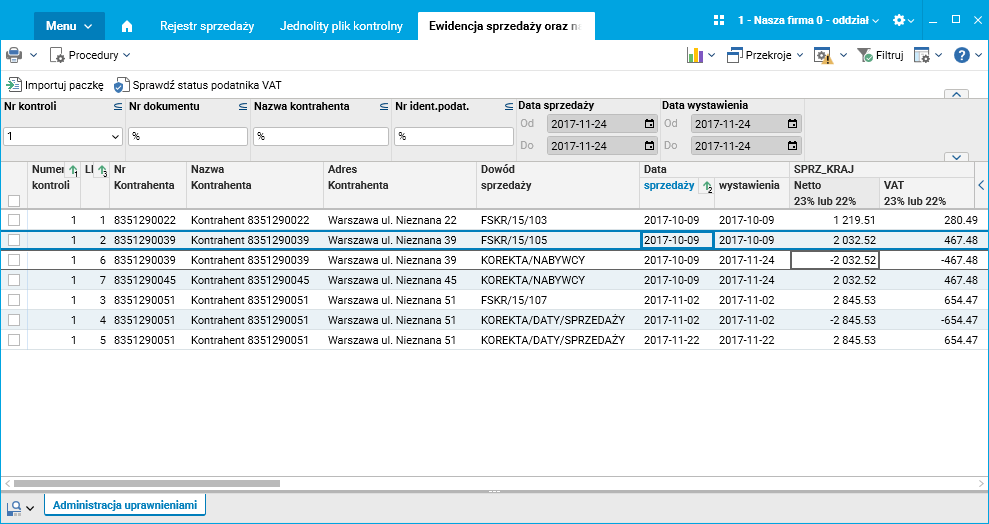 Podobnie jest dla faktury FSKR/15/107. Wykazana jest ona z datą sprzedaży 2017-11-02, a korekta KOREKTA/DATY/SPRZEDAŻY stornuje fakturę z datą sprzedaży 2017-11-02 oraz tworzy jej kopię (faktury) z datą sprzedaży 2017-11-22 i przenosi na nią kwoty z pierwotnej faktury.