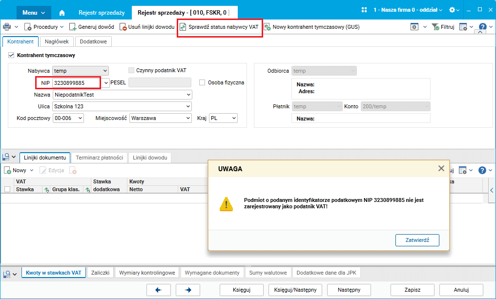 Rys. Wynik użycia procedury Sprawdź status nabywcy VAT podczas edycji dowodu z kontrahentem tymczasowym.