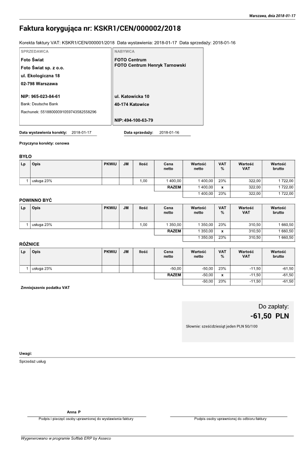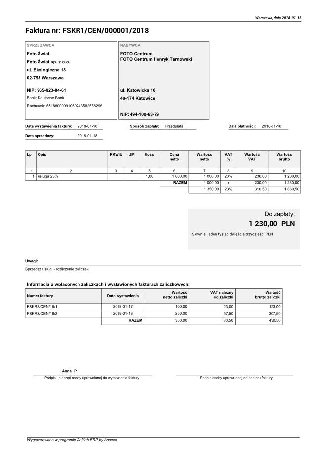 Poniżej przykładowy wydruk korekty oraz faktury rozliczającej zaliczkę.
