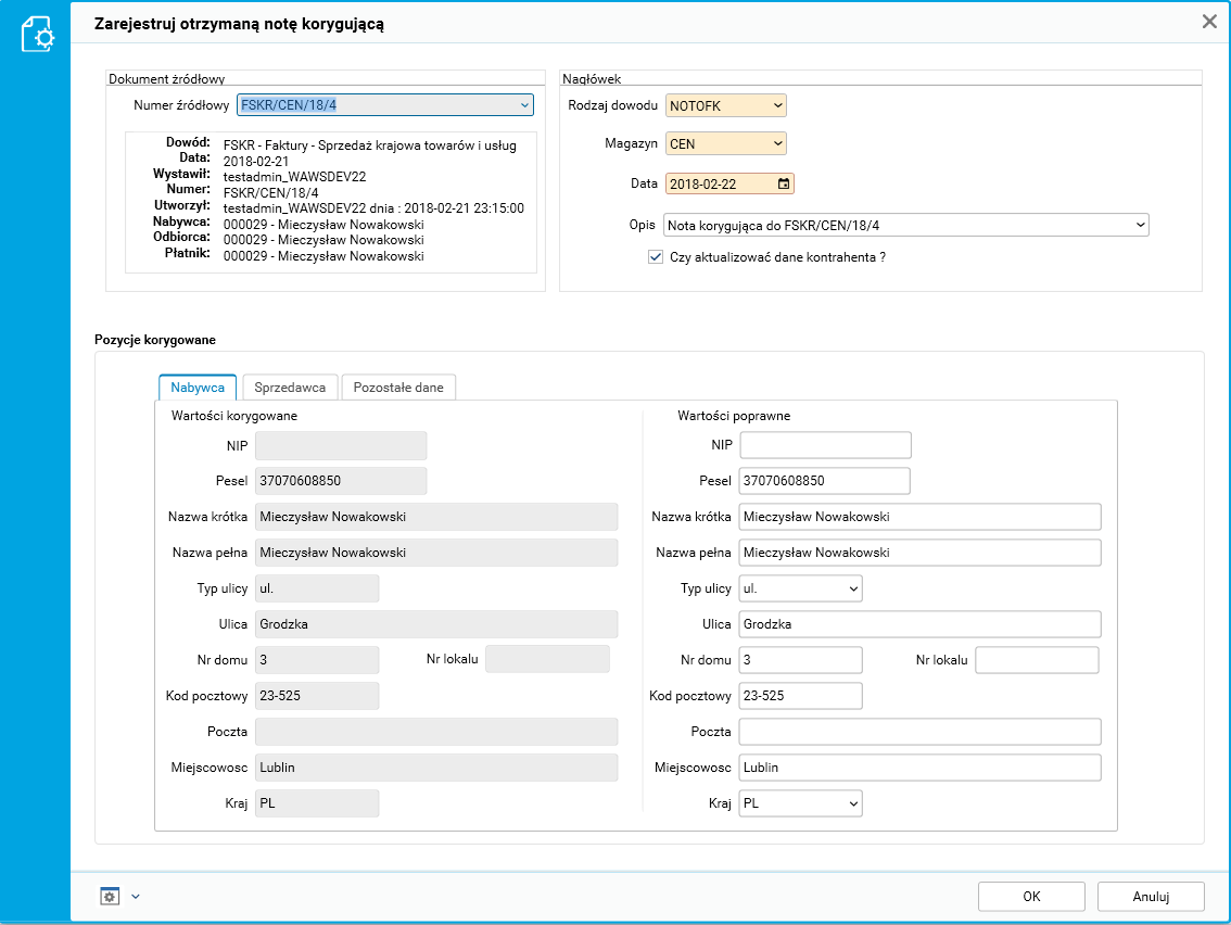 Podczas rejestracji otrzymanej noty korygującej została dodana możliwość skorygowania danych dla każdego z podmiotów z osobna: nabywcy, odbiorcy i płatnika oraz sprzedawcy. Zarówno przy rejestracji otrzymanej noty, jak i przy wystawianiu noty korygującej możemy modyfikować: