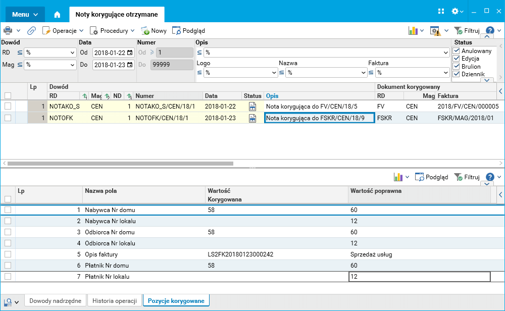 Poniżej fragment zarejestrowanej noty korygującej otrzymanej, w przypadku której były modyfikowane nr domu, nr lokalu oraz opis faktury. Zmiana numeru domu i numeru lokalu została wykonana dla wszystkich trzech podmiotów: nabywcy, odbiorcy i płatnika, bo był to ten sam podmiot.