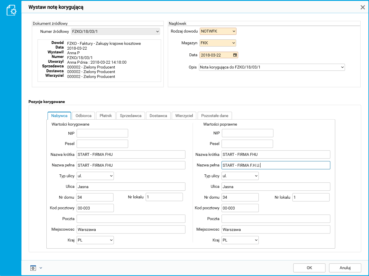 W przypadku zakupu na zakładce Nabywca znajdują się dane firmy, na której pracujemy. Mimo że w systemie nie ma danych odbiorcy i płatnika tej firmy (a raczej zakładamy, że jest to ten sam podmiot), to można do nich wystawić notę korygującą (zakładki: Odbiorca i Płatnik).