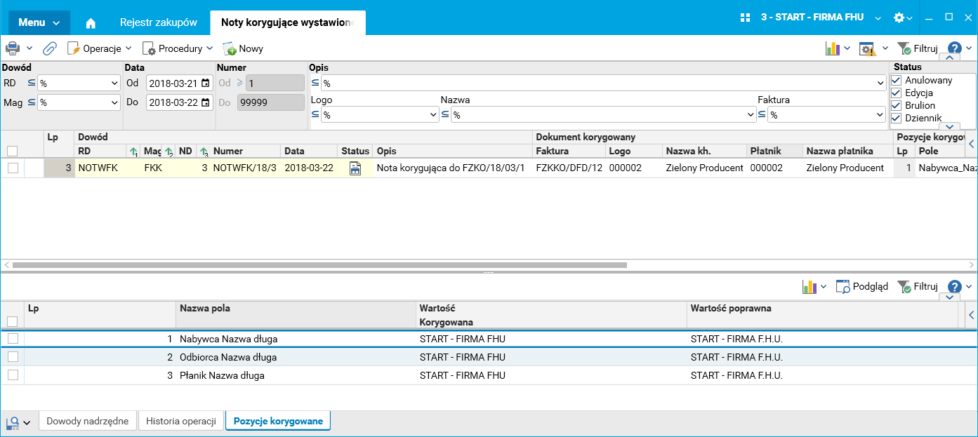 Poniżej fragment wystawionej noty korygującej, w przypadku której była modyfikowana nazwa pełna nabywcy. Zmiana nazwy została wykonana dla wszystkich trzech podmiotów: nabywcy, odbiorcy i płatnika, bo to był ten sam podmiot.