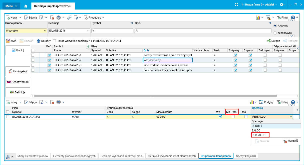 Do wersji 88 w słowniku Definicja linijek sprawozdań dostępne były tylko operacje SALDO i OBROTY. Operacja SALDO mogła być oznaczona atrybutem: Wn, Ma lub persaldo. Dla persalda zwracała obroty Ma-Wn. Gdy chcieliśmy określić persaldo Wn, wymagało to użycia znaku minus. Ponadto operacja OBROTY z atrybutem Wn zwracała kwotę ze znakiem minus, co było uciążliwe przy definicjach linijek sprawozdań.