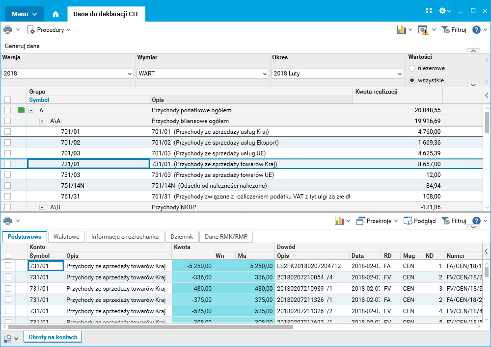 Do słownika Dane do deklaracji CIT został dodany słownik szczegółowy Obroty na kontach prezentujący pełne informacje o poszczególnych zapisach na kontach dla wybranej pozycji raportu.