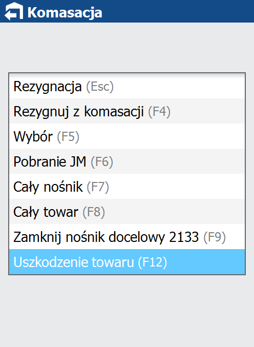 W procesach: zbiórka towaru, rozkładanie towaru i komasacja nośników dodana została możliwość zgłoszenia uszkodzenia towaru bez stwierdzania jego braku. W każdym z tych procesów obsługa uszkodzenia wygląda analogicznie. W zbiórce i rozkładaniu towaru uszkodzenie zostaje zgłoszone dla aktualnie zbieranego/rozkładanego towaru. W procesie komasacji dodatkowo podawany/skanowany jest kod towaru uszkodzonego.