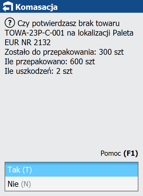 Kolejnym krokiem zgłaszania uszkodzenia jest potwierdzenie ilości uszkodzonego towaru. Towar uszkodzony należy odwieźć do lokalizacji zdefiniowanej jako lokalizacja uszkodzeń, o czym system poinformuje użytkownika na kolejnym ekranie.