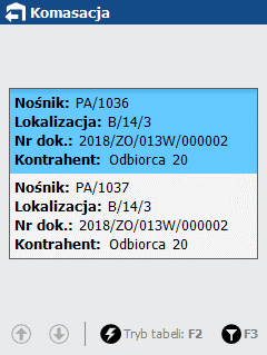 W aplikacji WMS Client w procesie komasacji dodano listę nośników powiązanych z tym samym zamówieniem od odbiorcy lub zleceniem wydania co odczytany nośnik źródłowy. Zmiana ma na celu ułatwienie wyboru nośnika docelowego dla komasowanego towaru tak, aby rozmieścić go w sposób najbardziej efektywny i umożliwić zmniejszenie ilości wykorzystywanych nośników docelowych.