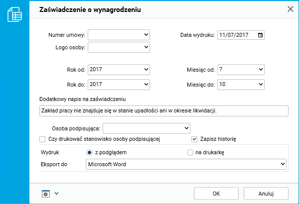 Rys. 1. Parametry raportu Zaświadczenie o wynagrodzeniu