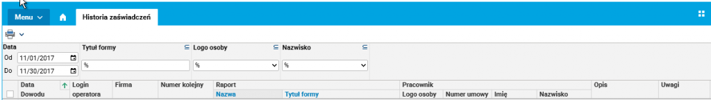 Użytkownik może określić przedział czasowy, wybrać tytuł zaświadczenia oraz określić, czy interesują go zaświadczenia konkretnego pracownika czy wszystkich.