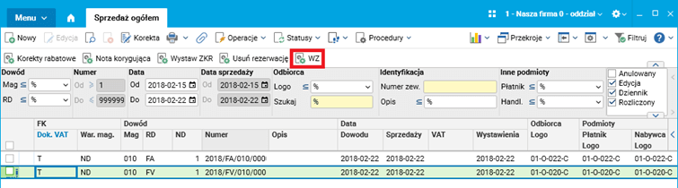 Rys. Rejestr Sprzedaż ogółem, procedura WZ dostępna dla dowodu FV