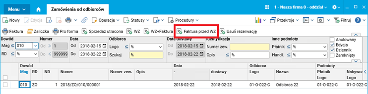 Rys. Rejestr Zamówienia od odbiorców, procedura Faktura przed WZ dostępna dla dowodu ZO