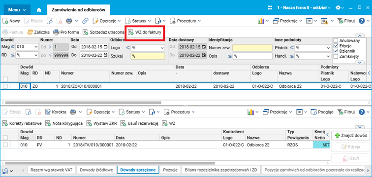 Rys. Rejestr Zamówienia od odbiorców, procedura WZ do faktury dostępna dla dowodu ZO