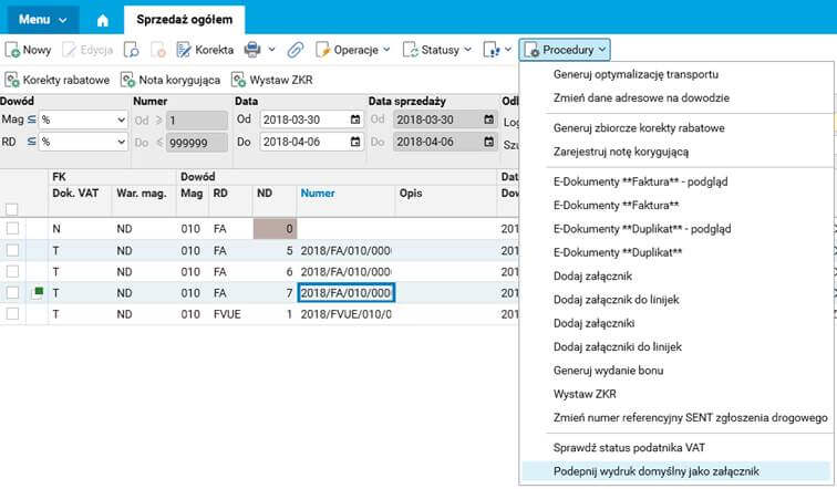 Wykonanie procedury powoduje dołączenie domyślnego wydruku jako załącznika.