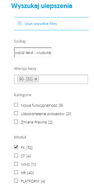 Rys. 1. Filtry, które pozwalają wyszukać zmiany dotyczące systemu ERP w wersji 90