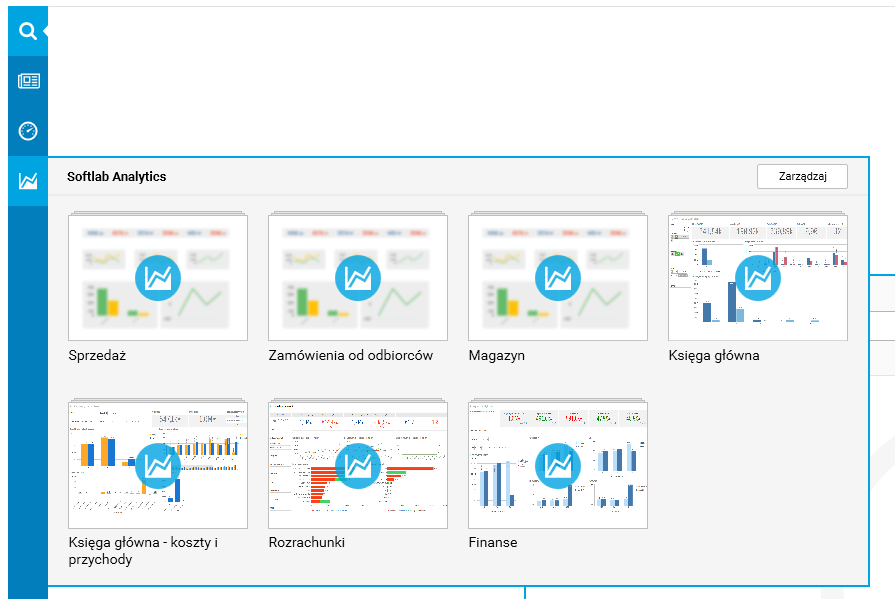 Rys. Panel Softlab Analytics po kliknięciu przycisku Zarządzaj w menu poziom 1