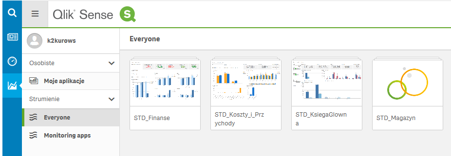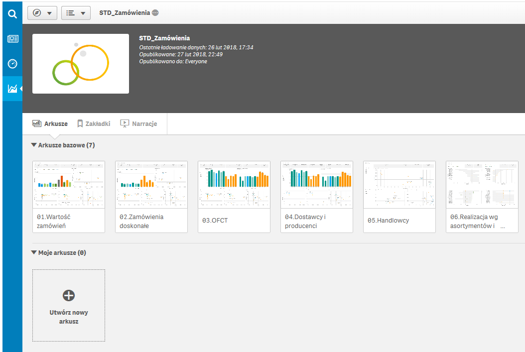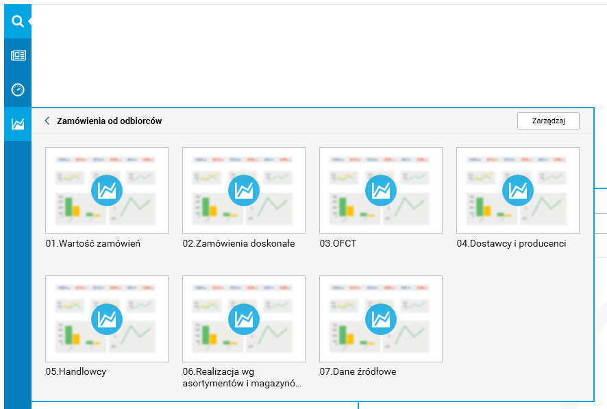 Na drugim poziomie menu Softlab Analytics wyświetlone są arkusze powiązane z wybraną aplikacją. Nad panelem arkuszy znajduje się wskazanie aplikacji, w której aktualnie się znajdujemy. Jest tam również przycisk Zarządzaj, dostępny tylko w przypadku posiadania licencji ‘Edit’. Pozwala on zarządzać arkuszami dostępnymi dla użytkownika, umożliwia także powrót do menu poziomu pierwszego.