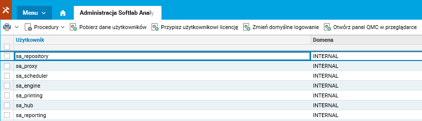 · Pobierz dane użytkowników – pobiera wszystkich użytkowników z Softlab Analytics (po uruchomieniu słownika warto uruchomić tę procedurę w celu pobrania aktualnych danych),
