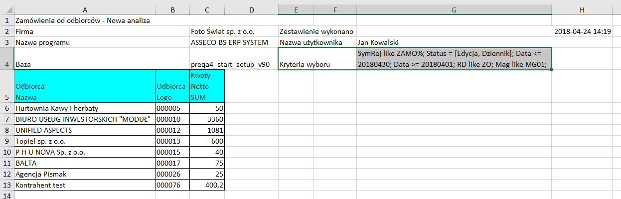Do tej pory analizy generowane do formatu XLSX nie wskazywały kryteriów, przy jakich analiza została wygenerowana.