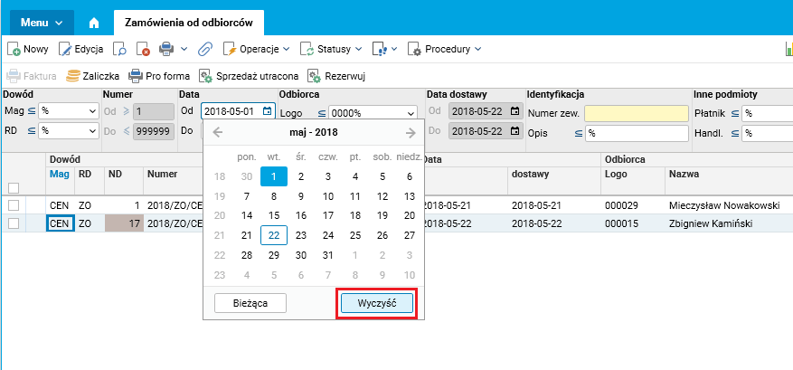 W okienku wyboru daty został dodany przycisk Wyczyść. Po jego kliknięciu maska z datą zostanie wyczyszczona, a okienko z kalendarzem się zamknie.
