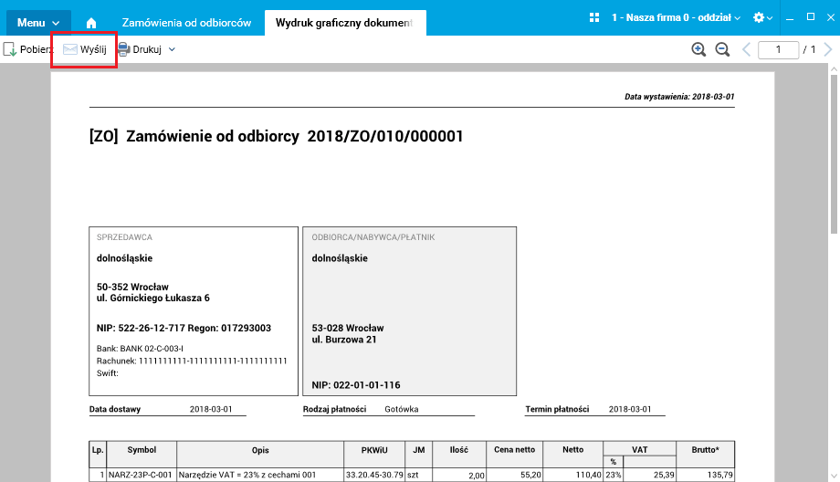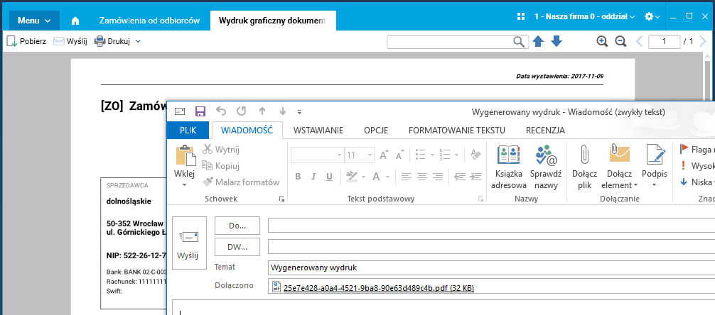 Umożliwiono szybką wysyłkę wygenerowanego raportu z okna podglądu wydruku, bez konieczności zapisywania raportu w pliku i podłączania go do przygotowanej wiadomości e-mail.
