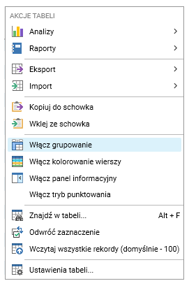 W tym celu w menu Akcje tabeli (prawy przycisk myszy w lewym górnym rogu tabeli) wybiera opcję Włącz grupowanie: