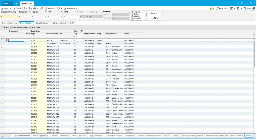 W tym celu handlowiec uruchamia słownik Kontrahenci w domyślnym ustawieniu, a następnie personalizuje go ustawiając filtry, usuwając nieużywane kolumny, zmieniając kolejność kolumn i widoczność słowników szczegółów. W efekcie uzyskuje słownik, który przedstawia się następująco: