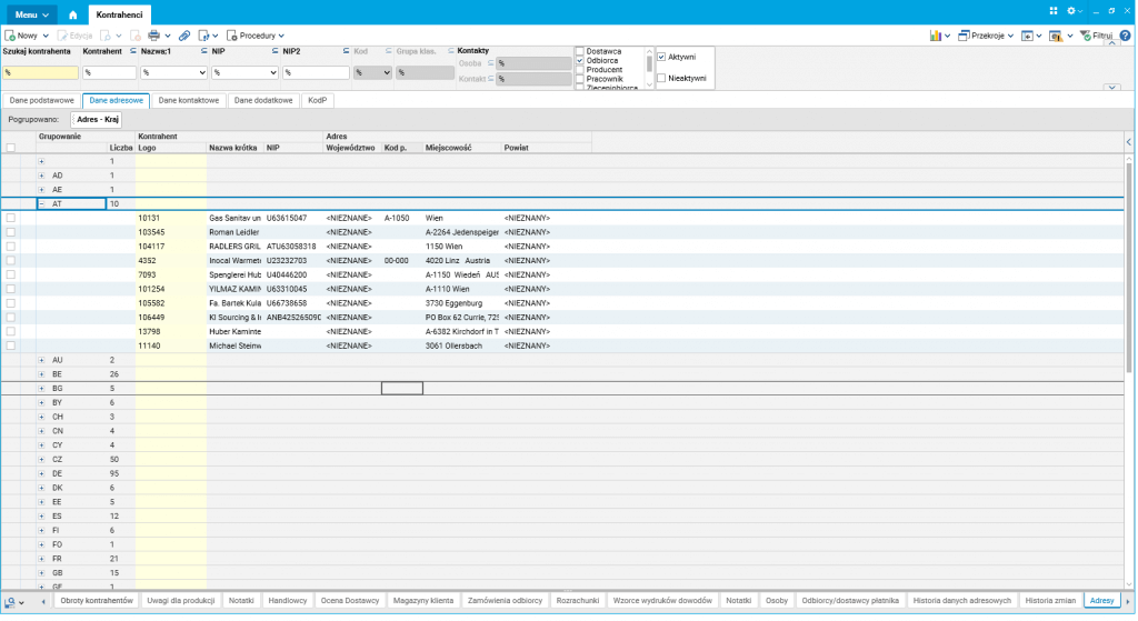 System Softlab ERP by Asseco prezentuje standardowo dane w słownikach w formie tabeli. Użytkownik chce przeglądać dane kontrahentów w formie zgrupowanej po kraju.
